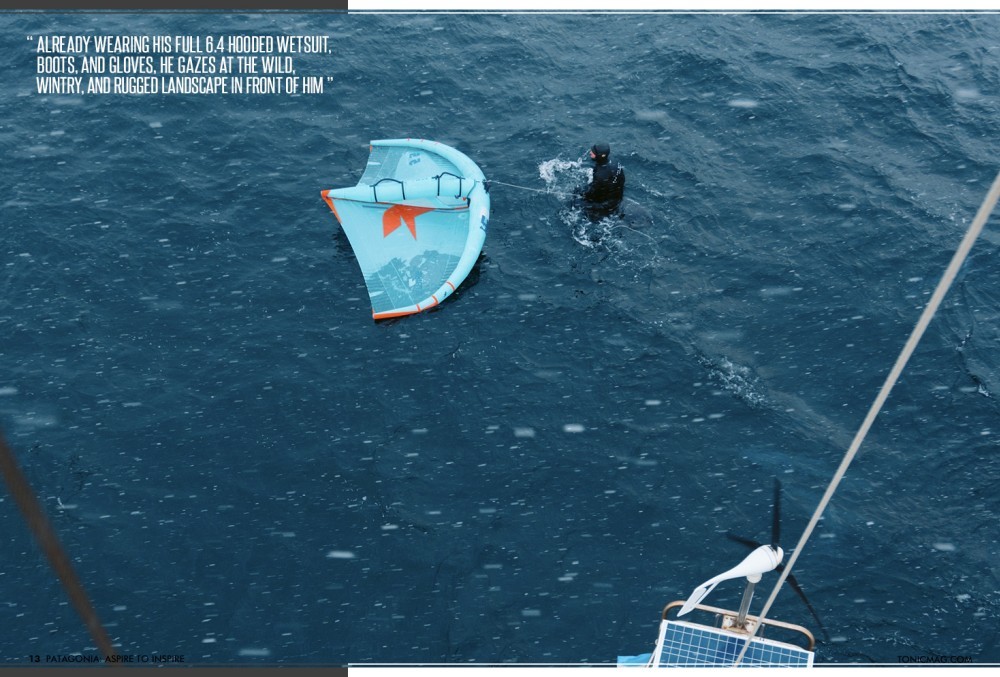 The monohull that has been carrying him and a handful of other people for the last two weeks is still moving as he finishes setting up his foiling equipment before jumping in the ice-cold water. Already wearing his full 6.4 hooded wetsuit, boots, and gloves, he gazes at the wild, wintry, and rugged landscape in front of him.