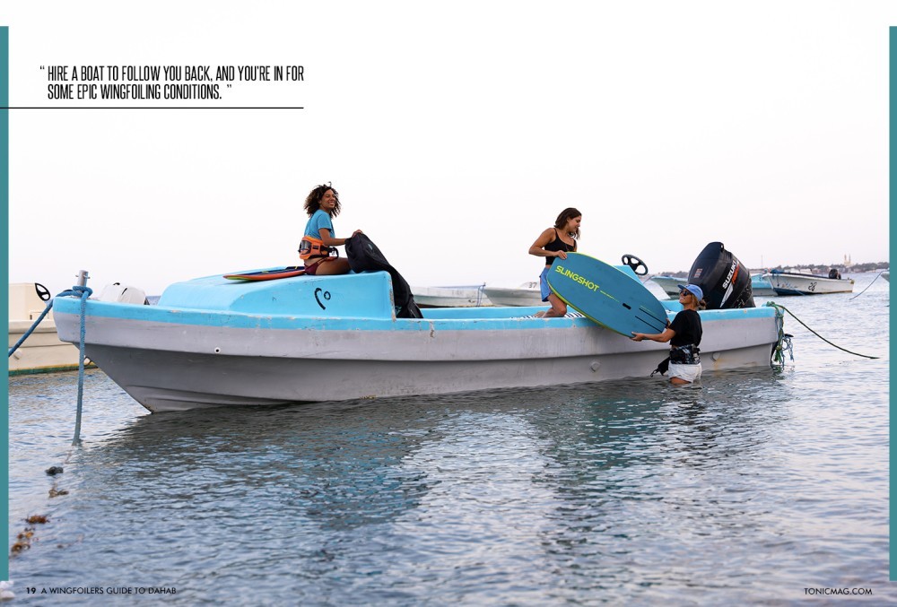 Leaving the blue lagoon, adventurous wingfoilers can ride along the coastline, playing in the rolling swell, arriving back in Dahab some 45-60 minutes later. Hire a boat to follow you back, and you’re in for some epic wingfoiling conditions.