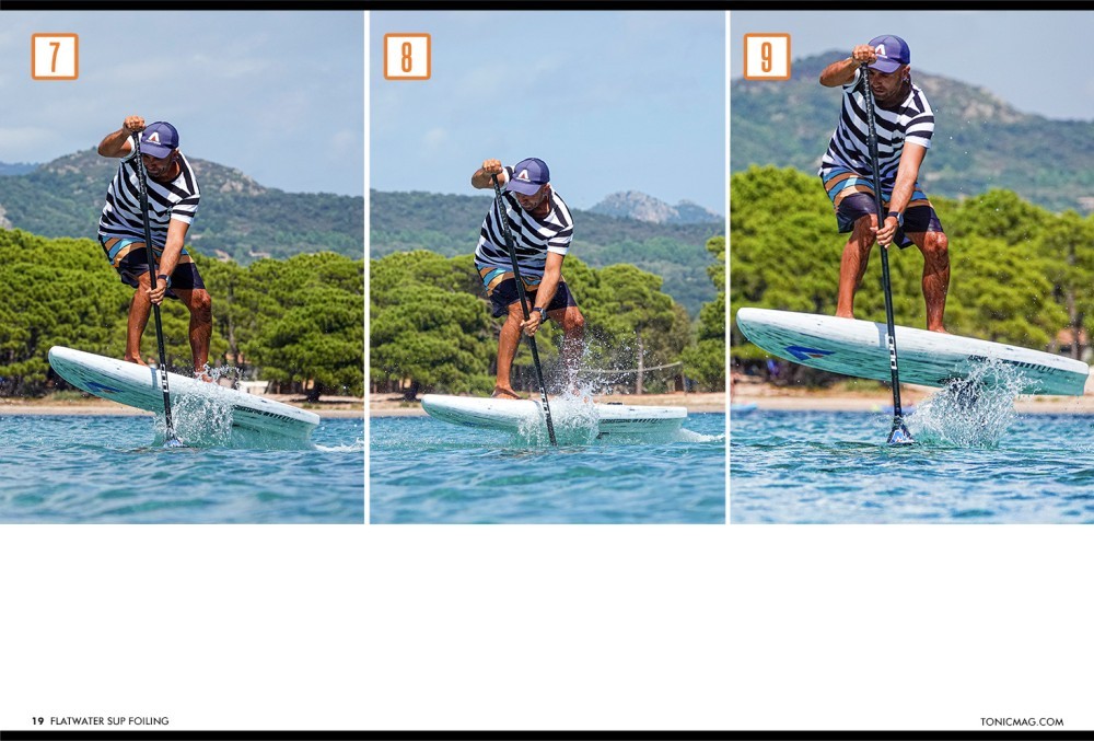 In this phase, you continue paddling forward and deep while bending your knees as you reach forward. This automatically initiates the foil's pumping action. Focus on maintaining front foot pressure and ensure your knees are bent while paddling forward. Be patient and just continue a little more; you’re nearly there!