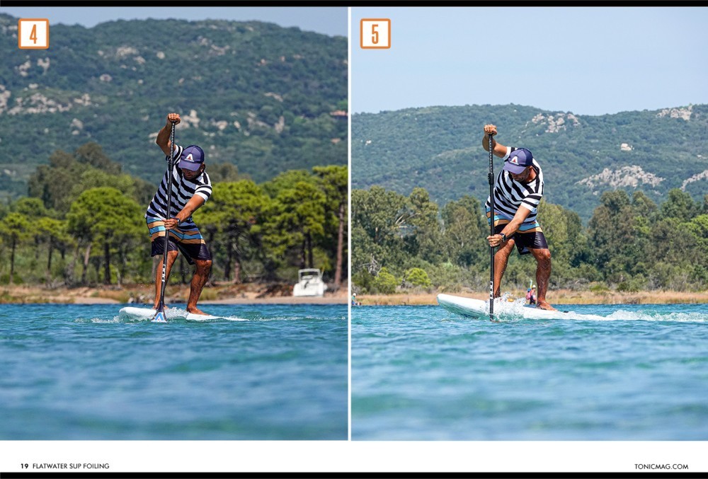 The initial step is to build up some speed without considering the foil. Before the first photo, Phil takes a few gentle strokes to ensure that his board is heading in the right direction and lying flat on the water. These initial strokes provide some speed and stability, allowing him to establish his stance. Phil's preferred stance involves placing his back foot roughly over the leading edge of the mast and his front foot just ahead of the front wing of the foil. This stance provides comfort and places slightly more weight on the front foot. From now on, maintaining focus and efficiency is crucial, as there is no room for wasted energy.