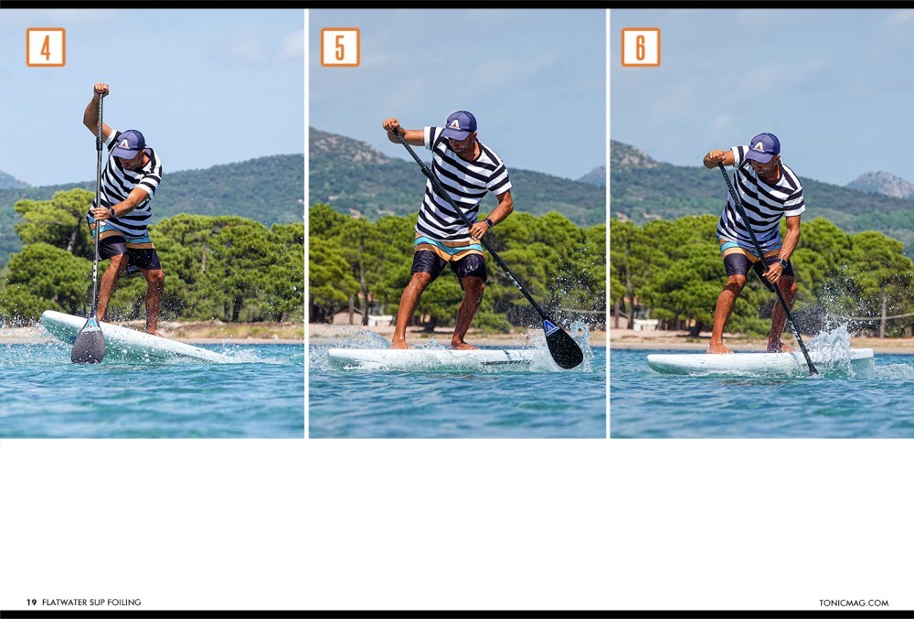 Continuing with powerful and forward strokes, you'll notice that the board starts to plane, and the nose lifts slightly above the water's surface. You're on the right track!