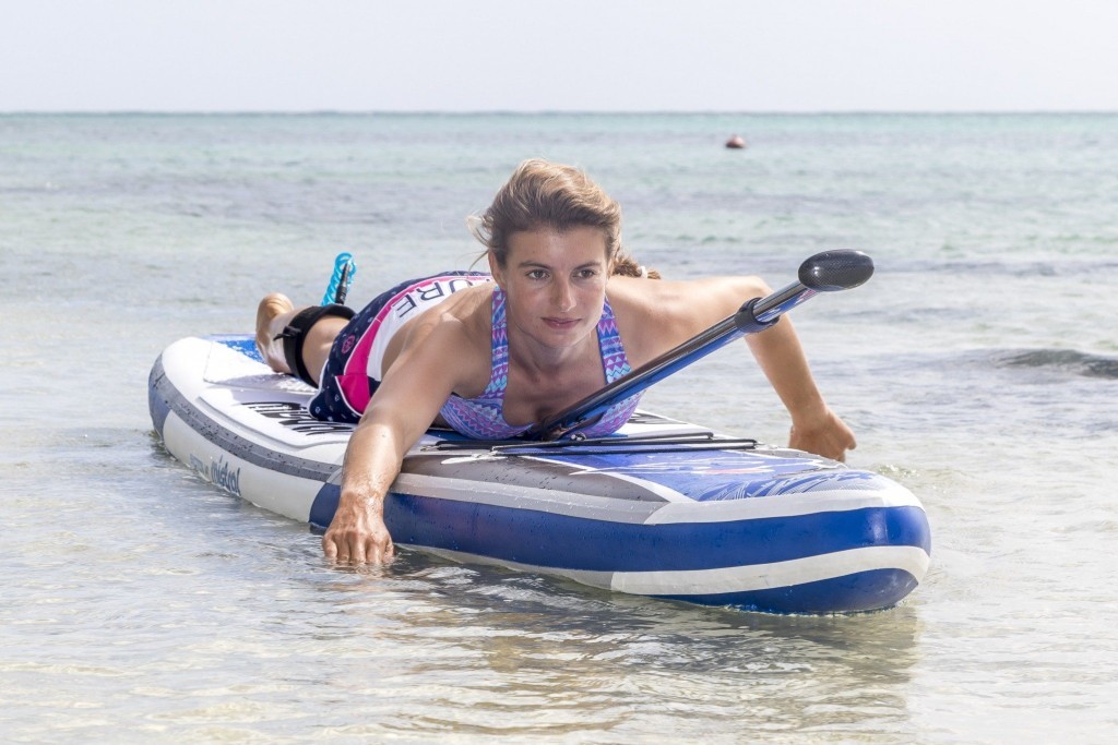 Remember to firmly secure your leash before attempting to climb aboard (safety first). Placing the paddle laterally across the mid-nose section of the board and firmly grasping the board rails, mount the board on your knees ensuring that you position them in the centre. The majority of deck pads or board decks will have a centre line running through them, where the board stringer would usually be, that visually illustrates “plumb” centre.