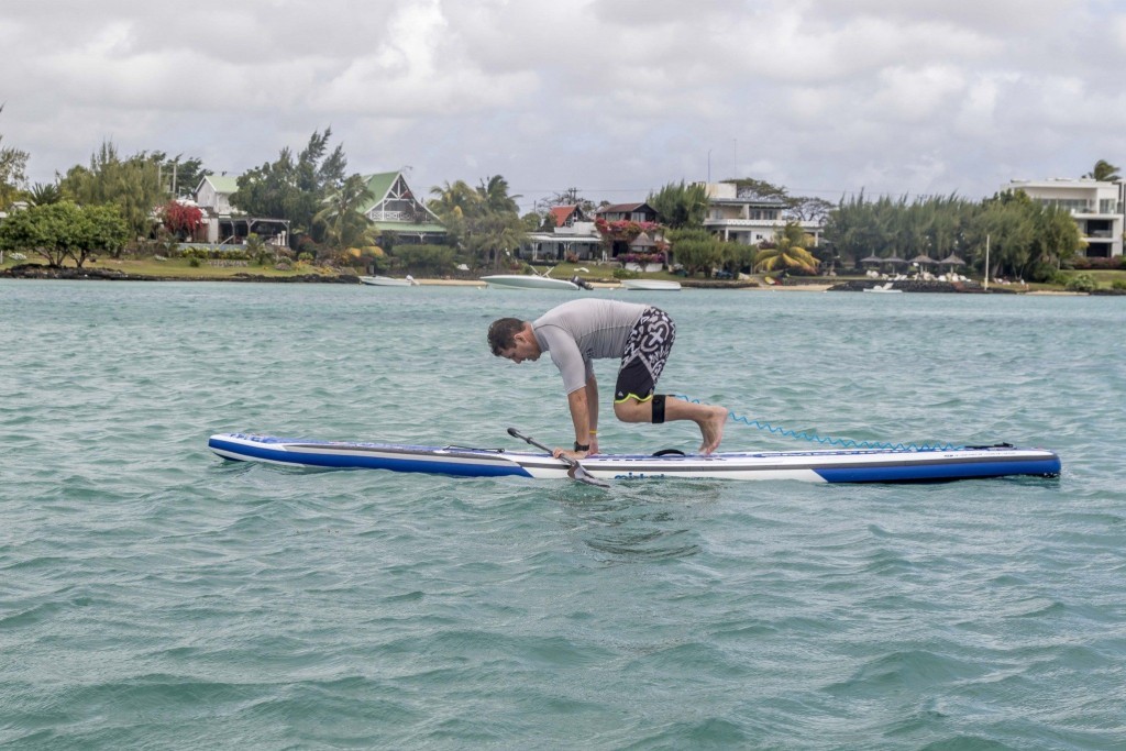 Placing your knees on either side of the centre line, roughly shoulder width apart will provide you with the appropriate balance to get started. If you find the nose of the board is dipping under the water or, you find yourself closely emulating the “Titanic’s” final graceful moments before she headed for the bottom of the North-Atlantic, you have not centred yourself correctly. Shift your position either forwards or backwards, towards the central balance point of the board. The location of the carry handle/strap/insert presents a good starting point to position your knees as this usually denotes the board centre.