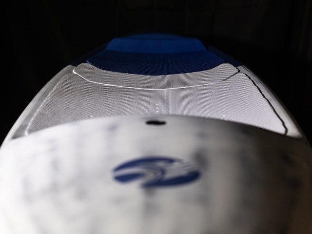 The Swift is a unique and eye-catching design. It is like a scaled-down version of the lovechild of a downwind foil board and an all-around race stand-up paddleboard. It has a lengthened outline, reduced width overall with a pulled-in nose and tail, an aggressive deck cut out and significantly chined rails. The sunken deck is as aggressive as I've seen. This reduces the distance between the rider's feet and the foil mast top plate and the rider's centre of gravity relative to the foil. The deck has a significant full-width camber, an aggressive lip on the kick pad at the tail, and a hard-angled section near the nose around the foot placement area. This cut-out deck leaves a bit of a bulb of volume at the nose.