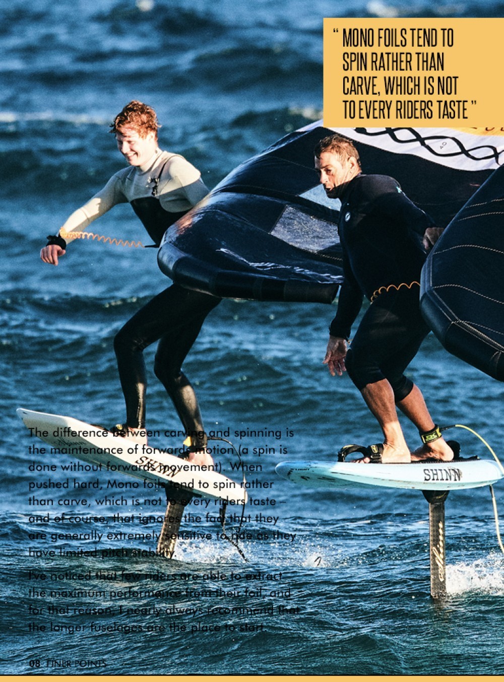The difference between carving and spinning is the maintenance of forwards motion (a spin is done without forwards movement). When pushed hard, Mono foils tend to spin rather than carve, which is not to every riders taste – and of course, that ignores the fact that they are generally extremely sensitive to ride as they have limited pitch stability.