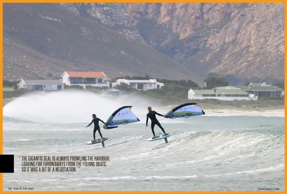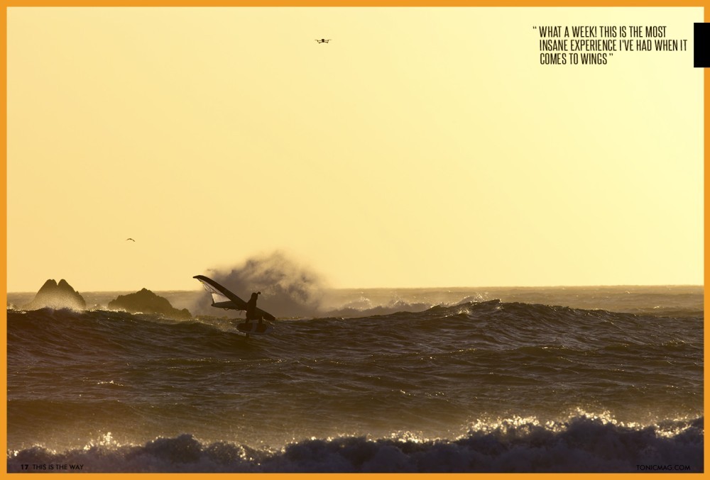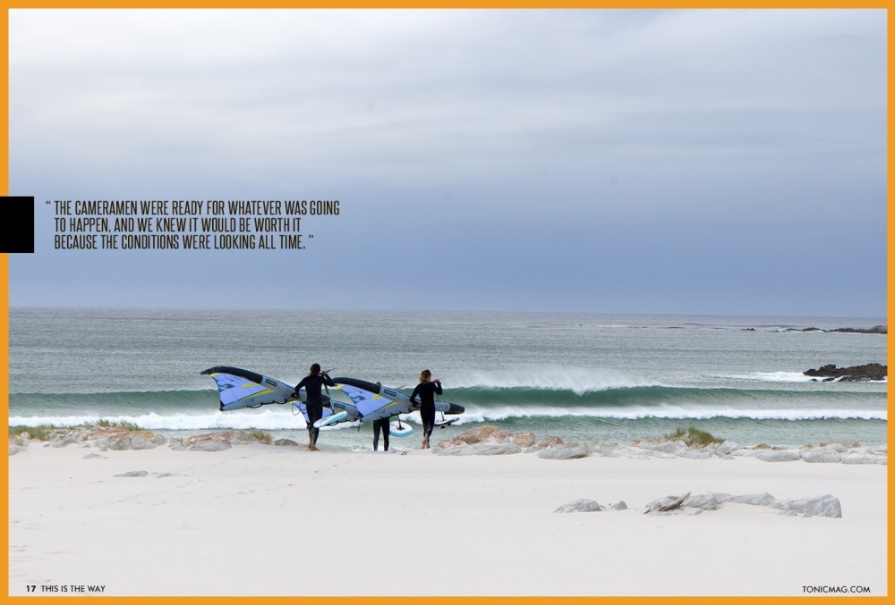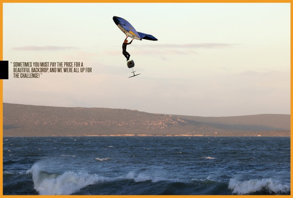 We realised how cold it was once we got into the water. It was an icy southeaster, and our hands were freezing. I remember looking at Jake and Tyler and shouting, "Can you guys feel your hands?!" They called back, "No!! But we're going to send it anyway!!" So we would wing a bit, stop in the water to blow on our hands to warm them up until we could feel them again, and then wing some more. We did our best to look cool for the camera (cool, not cold!) and have as much fun as possible for the next few hours.