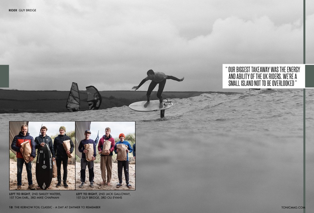 The judges huddled in the Mitsubishi Delica loaded with cheese baguettes and black coffee atop the prime spot of the amphitheatre that is Daymer. Wingers illuminated the beach with head torches, pumped up and ready to kick off the action as the sun sleepily rose above the dunes. This was it; the horn blew, and the Kernow Foil Classic was underway. What followed was nothing short of a whirlwind of 15-minute heats, beach sprints, lightning-fast rash vest swaps, and mind-bending foil skills. We’re still trying to work out how and why Guy Bridge is so bloody fast.