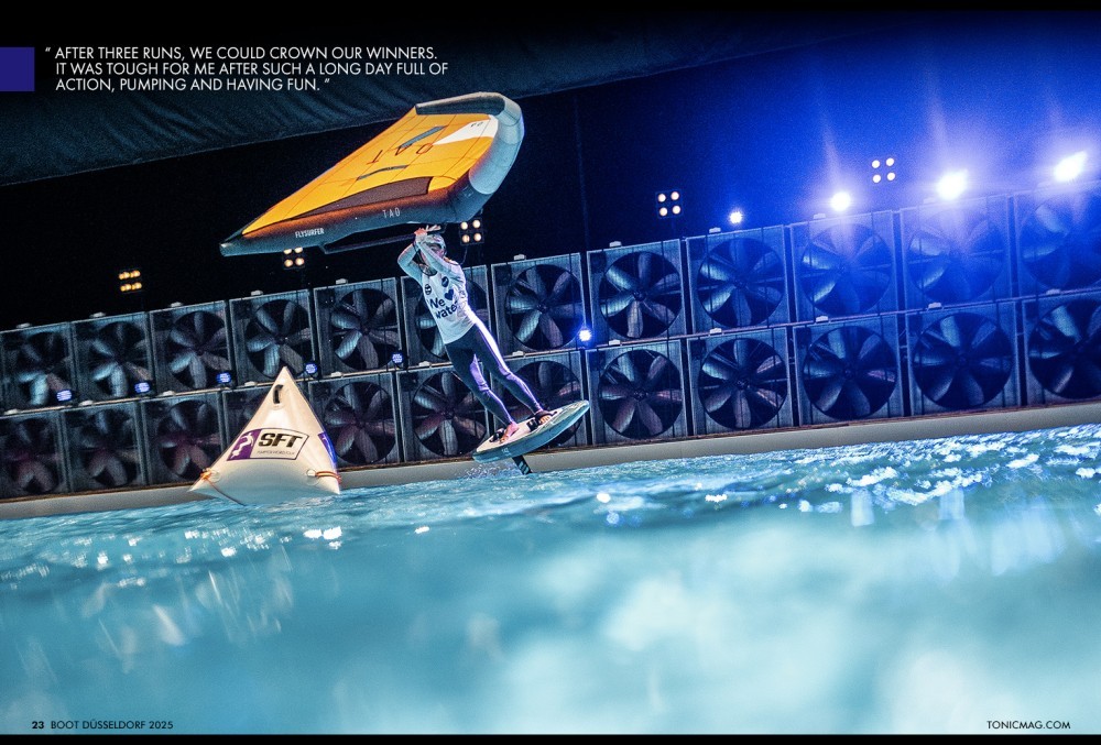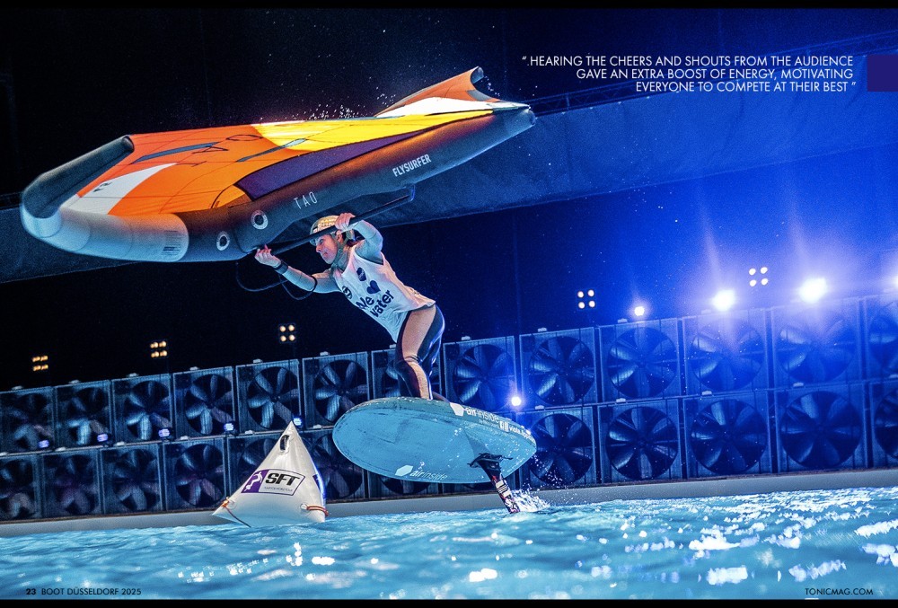 Standing on the second step of the podium at the first-ever GWA wing foil indoor race and the inaugural SFT pump foil contest was an incredible experience. I never imagined competing in a pool could be so much fun and exhausting. The large group of spectators, including excited kids and adults cheering just a few meters away, was truly remarkable. I thoroughly enjoyed participating and sharing a wonderful time with all the athletes at BOOT Düsseldorf. This event will definitely be one for the books!
