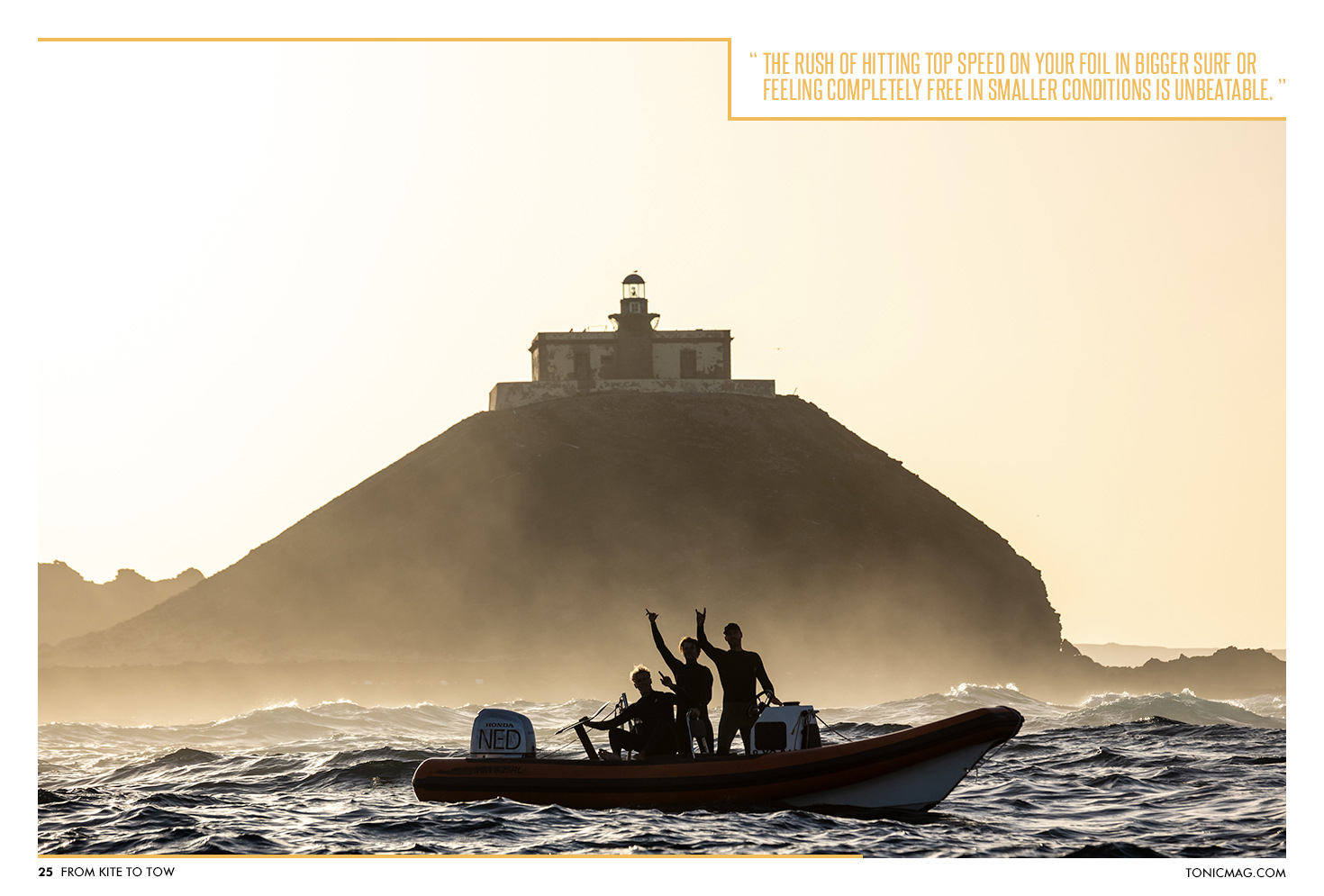 Not a wing or a kite, not a paddle, but just a rope tied to a boat or jet ski to get you into a wave. Tow foiling opens the door to riding bigger waves with total freedom once you are on them. It is a great way to focus purely on the foil, keeping it in the water and staying in the right part of the wave. The rush of hitting top speed on your foil in bigger surf or feeling completely free in smaller conditions is unbeatable. The freedom of not having a wing in your hands or a kite to keep in the air, while riding a small board and foil, is what makes it so special.
