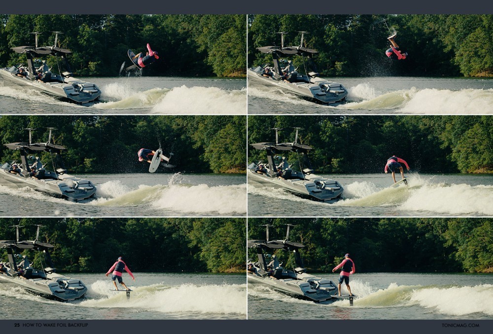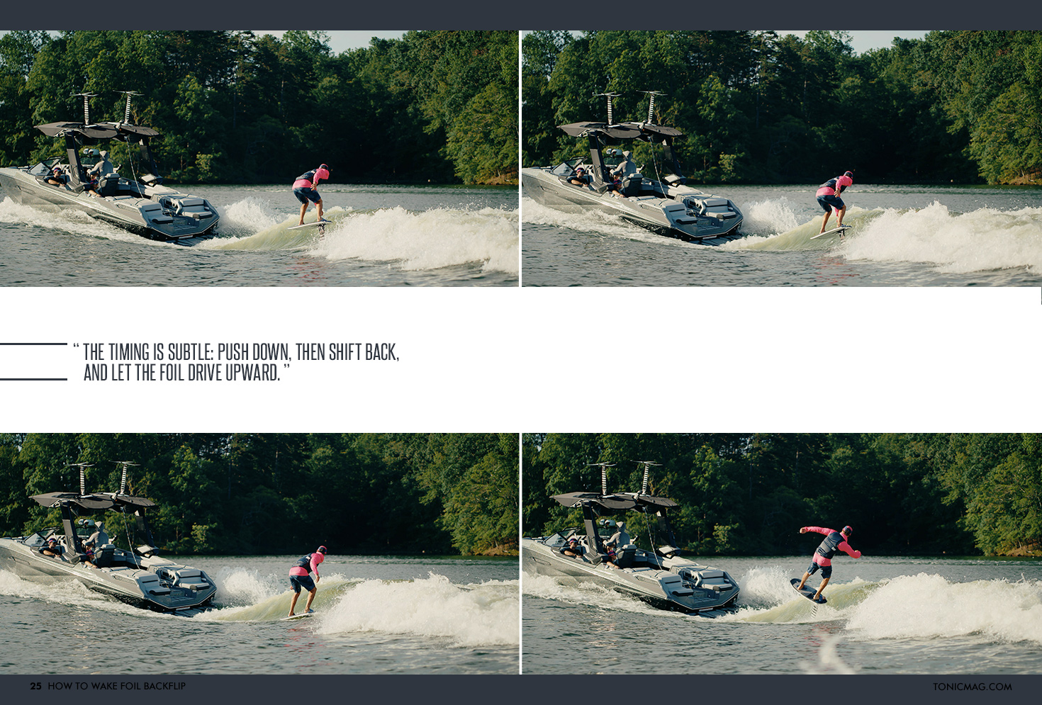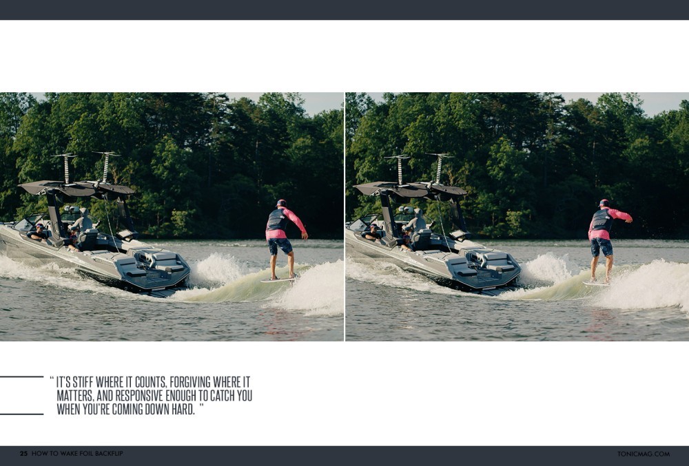Start by stalling back on the wake when setting up for the backflip. I prefer to be 1-3 feet behind the break of the wake. This pause gives you the space to build your line toward the flip.