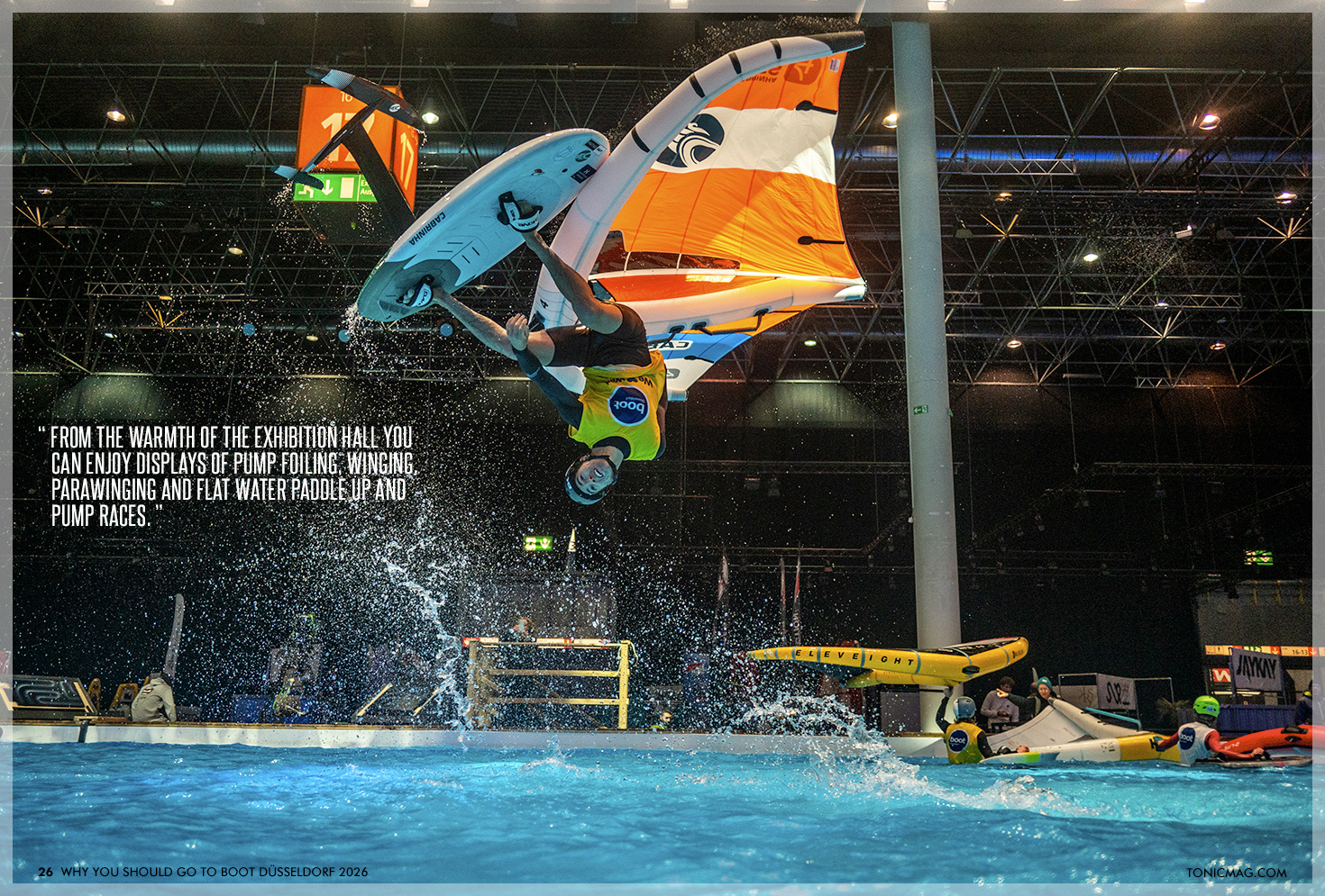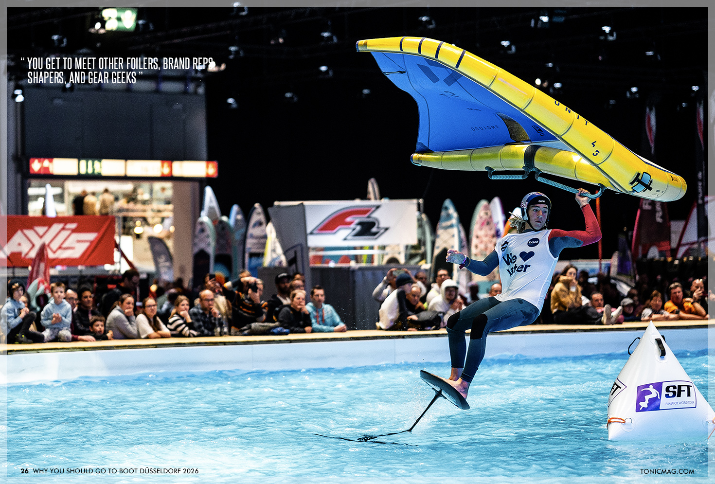 At the heart of boot 2026 is the massive indoor pool in Hall 17. 62 metres long and filled with 1.3 million litres of water, turning the show floor into a live playground. Top-level competitors will ride wingfoils, SUPs, pump-foils and more, often in world-cup-class contests like the GWA Indoor Wingfoil World Cup, the SFT Surf Foil World Tour and the EuroTour SUP Indoor World Cup.