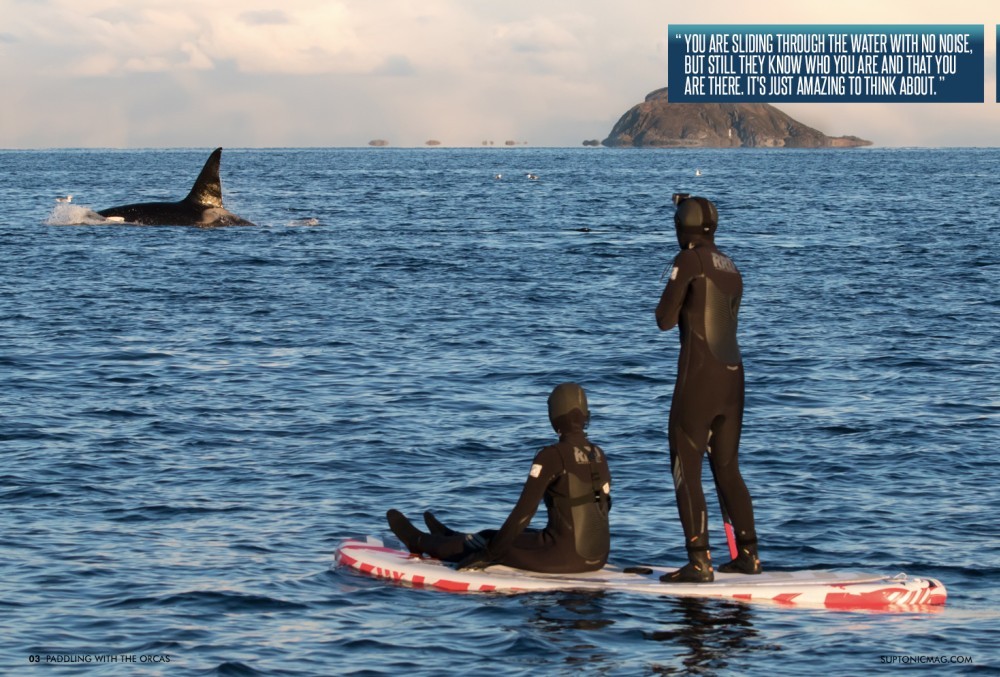 The first time I was on the SUP, the orcas were swimming around the board just looking at me. They were checking me out, who I was and what I was doing. I admit I was a bit shaky when they came up only inches from the board, but after a while, I felt they were just friends swimming around us. The SUP board is so quiet, and you are sliding through the water with no noise, but still they know who you are and that you are there. It's just amazing to think about.