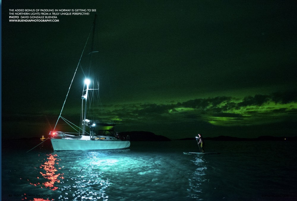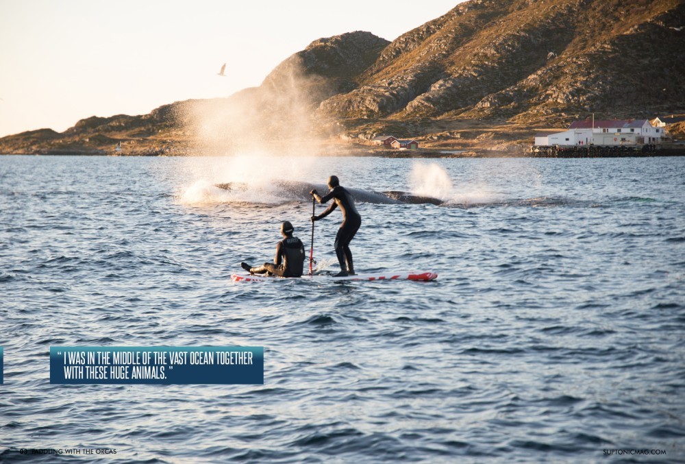 During my last SUP session, I headed out as the sun was starting to dip low on the horizon. Suddenly the orcas appeared and played with me. I was in the middle of the vast ocean together with these huge animals. There was snow on the mountains, calm seas and fantastic light. The light is magic up here at this time of year, it's the Arctic pink, warm light, as I like to call it.