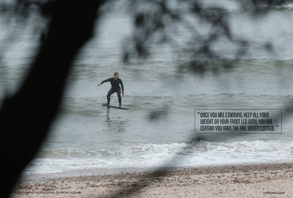 From a surfing background you know well that you mustn’t have your weight too far forward on the board, especially when taking off, or you will nosedive. On the foil it’s actually helpful to shuffle your chest forward on the board a couple of inches as you are paddling in, as this helps keep the foil in the water as you get to your feet. Once you are standing, keep all your weight on your front leg until you are certain you have the foil under control and it’s not going to breach. This is the bit most surfers struggle with as you’re so used to surfing off the back foot.
