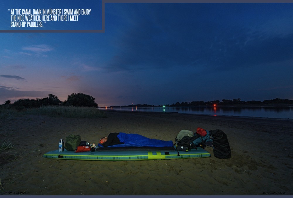 So the next morning we continue halfway rested. The Dortmund-Ems Canal offers no surprises worth mentioning and relatively little shipping traffic. Slowly I approach the student city. At the canal bank in Münster I swim and enjoy the nice weather. Here and there I meet stand-up paddlers. When they ask me where I'm coming from and where I'm going, I answer truthfully with "Basel to Kiel". With it I earn beside respect and cheering also head shaking, which I can understand more and more. This canal drags and although I still have more than 150 km to Minden before me, I miss the fun at the eternal sheet pile walls right and left. However, complaining does not help, breaks do not bring me closer to my goal and so I paddle on. I have to carry around the Münster lock, which costs me about an hour. So I end the paddling day at 9pm. Quite randomly I look for a place to spend the night on the shore, when I pass three young people listening to "Santiano" while enjoying their shisha. The combination irritates me and so I stop and get into conversation with the guys. Although I don't smoke, I quickly find myself in nice company and decide to set up my night camp here. This procedure goes quite fast, I turn my board around 180 degrees and put my sleeping bag on the back. Although the board is hard as a base, after 14 hours standing on the SUP it is still easy for me to fall asleep in the evening. At night I startle when an angler approaches. However, the gentleman is relaxed and so I am happy about the nocturnal company and fall back to sleep within 5 minutes.