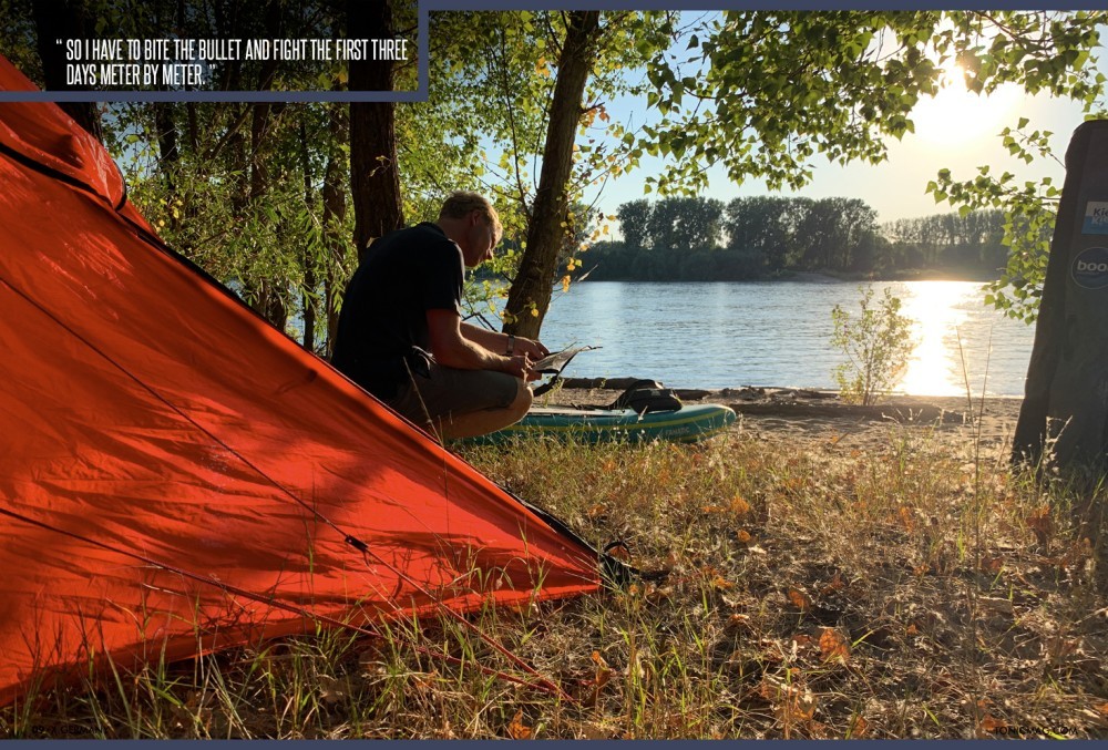 But the following kilometres are really fun. This oxbow is the only one with current and some passages even have level 1 white water. The board is well loaded in the water with 45kg of luggage and my 90 kilos and works its way safely and stably through the rapids. Thanks to my map, I can roughly estimate which areas are passable and which I have to portage around despite the stable board. Other than the first weir, most of the following portages are well signposted and passable except for slippery algae. Cheerfully and with good average speed I fly through the first 70 kilometres to the North. However, I quickly realise that the first kilometres were an exception. Of course I knew by travel reports of other paddlers that the Southern range has hardly current to exhibit, but already 1 to 2 km/h help noticeably - both the average speed and the motivation. So I have to bite the bullet and fight the first three days meter by meter. I always set up my night camps where the shore area appeals to me. The first one is directly at a weir. If I have to get out of the water anyway, I use the interruption immediately for the night's rest. On the second day I end up soaked by 5 hours of continuous rain in combination with a thunderous hailstorm at a campsite near Strasbourg. In order not to catch a cold right at the beginning, I dry myself here and try to give my equipment the same attention. Solar panel and powerbank should keep my smartphone and my Livetracker alive over the 3 weeks. Nothing would be more annoying than if the technical equipment would stop working in the second night.