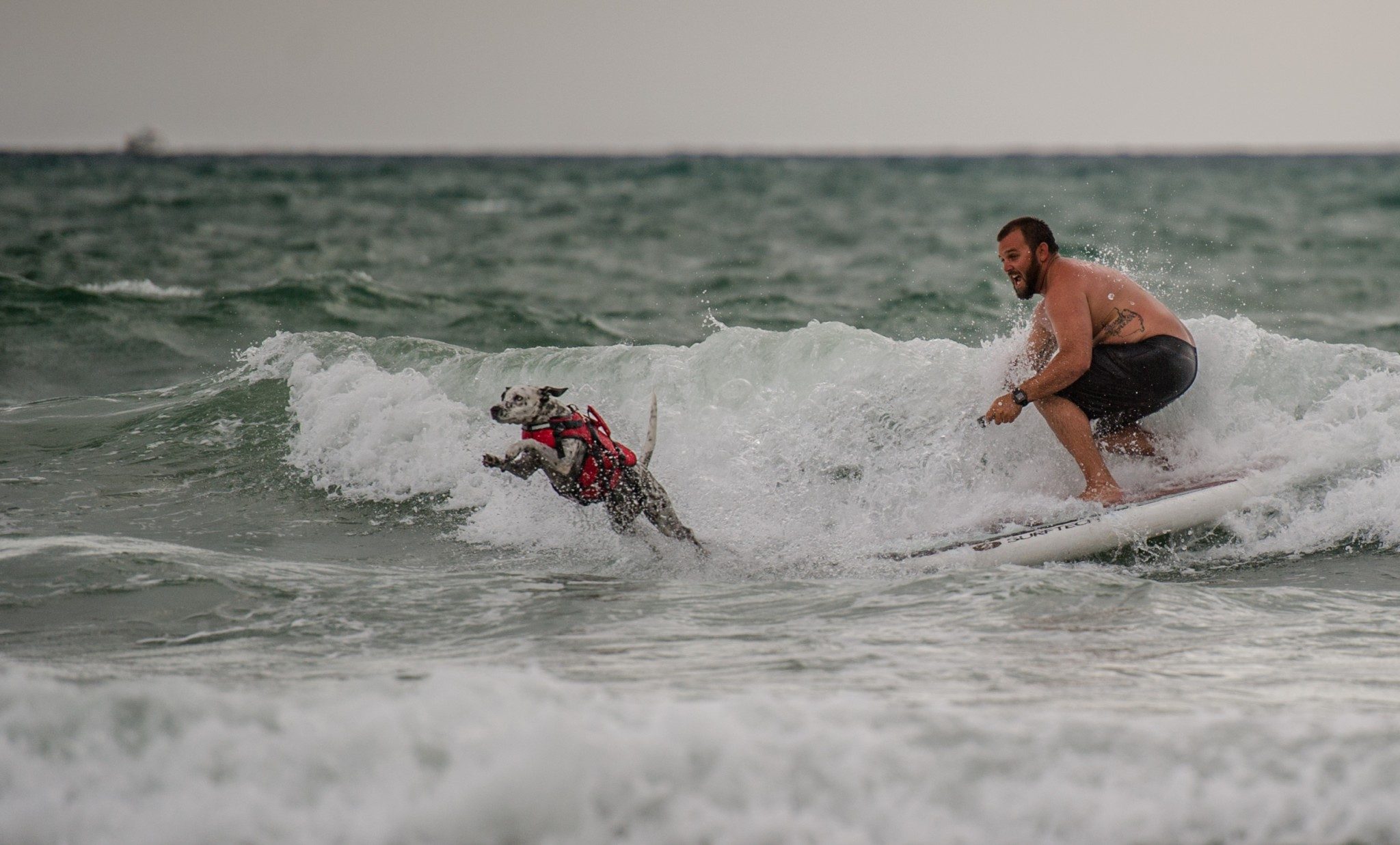 Known as the Dog Surf Whisperer, Sam initially encourages the pet’s family to get in the water with him so they feel comfortable. Often, he says, “It’s the humans more uncomfortable in the water than the dog. Once the dog gets his balance and begins to trust me, I can then give him the confidence needed to surf. It’s amazing to watch the transformation and pure joy they experience riding the board.”