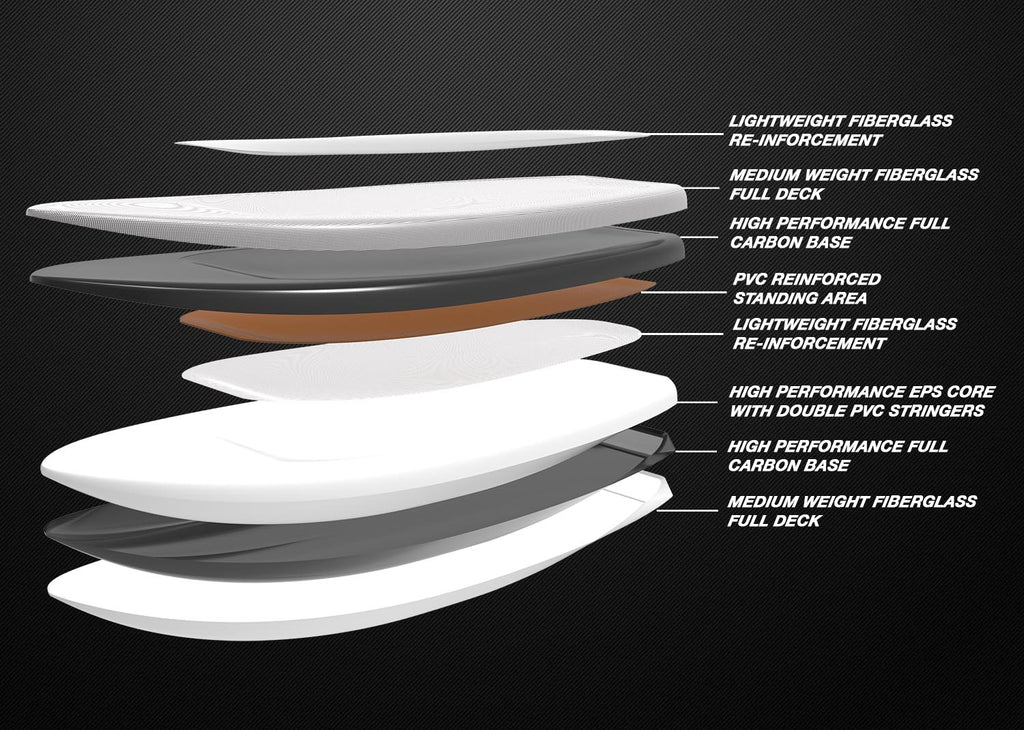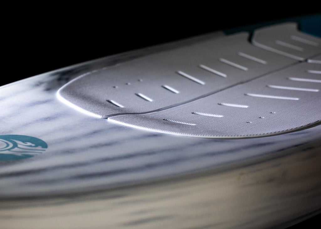 The new double concave nose of the board provides not only directional stability when getting up and riding or landing, but also facilitates calculated water displacement during touch downs and jumps.