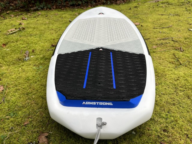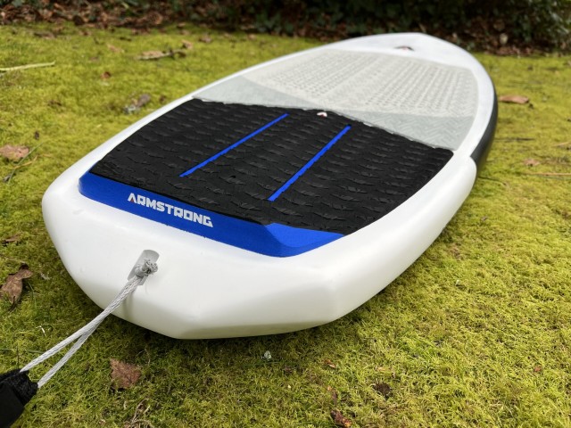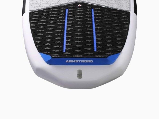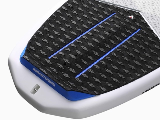 Armstrong has equipped the Surfboard with a meticulously designed deck grip featuring micro-cutouts for maximum traction and easy foot repositioning. A full-width kick pad at the rear offers enhanced grip and clear foil track placement markings, which I like because they assure you where your foot is when you pop up. The board also features foot strap inserts, which are a nice addition if you want to wing on the board or throw some flips!