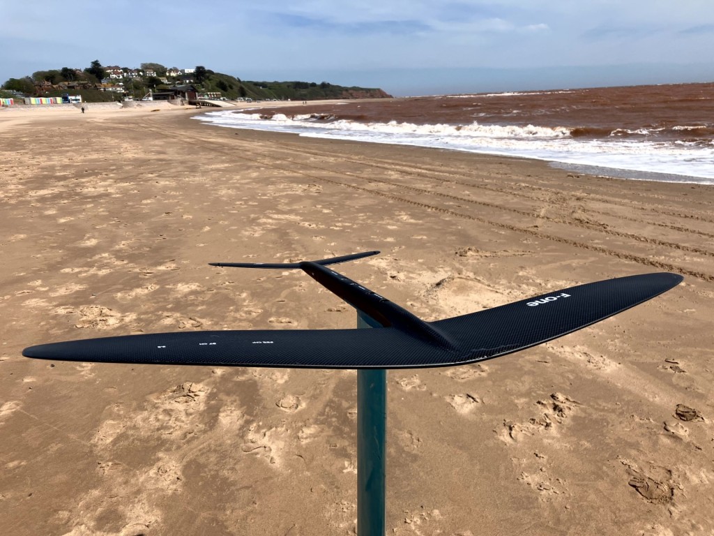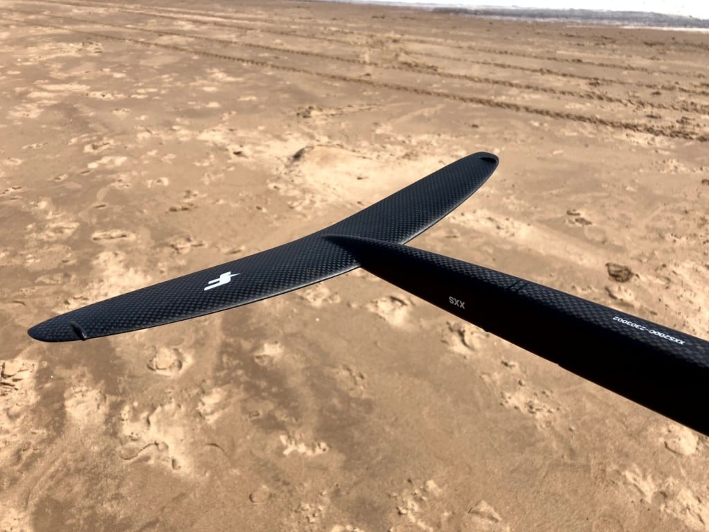 Having selected the 950cm2 foil to try (rider weight ~ 85kg), this included the XXS 200cm2 monobloc ‘carving’ tail. Both the front and rear wings have pretty thin profiles, a good amount of downturn (presumably to keep the tips lower during roll), and similar unassuming wingtip designs. The rear wing features F-One’s fences, little ridges in the direction of travel close to the wingtips, but the front wing does not.