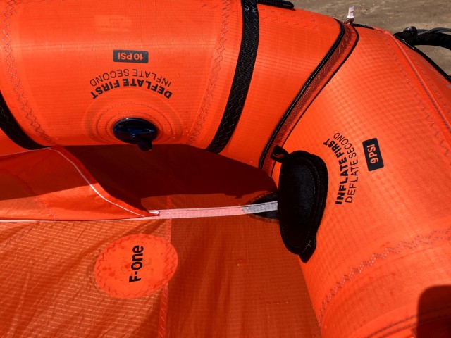 F-One have gone to great efforts to optimise the panel layout and orientation to improve performance, increase rider comfort in challenging conditions and prevent deterioration of the wing's performance over time. F-One have focused a lot of its marketing on introducing a number of new canopy and load frame material weights used in different locations throughout the wing to increase stiffness only where required so as not to increase the overall weight unnecessarily. Whilst this significant change isn't visually obvious when you first pump up the wing, many other design details implemented to control canopy tension distribution are. One of the first things you'll notice is the 'load diffuser' on the back of the strut at the leech of the wing. This reinforced mylar and dacron section ties nicely to the radially cut canopy sections in this area. These panels have been arranged to ensure the material fibres are oriented in the direction of maximum stress within the canopy. It is worth mentioning at this point that F-One's objective with all this was not to make the stiffest wing possible, but this so-called 'adaptive wing design' promises the perfect balance between performance and comfort. So, how did it stack up on the water?