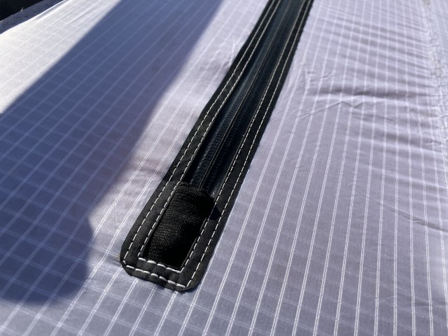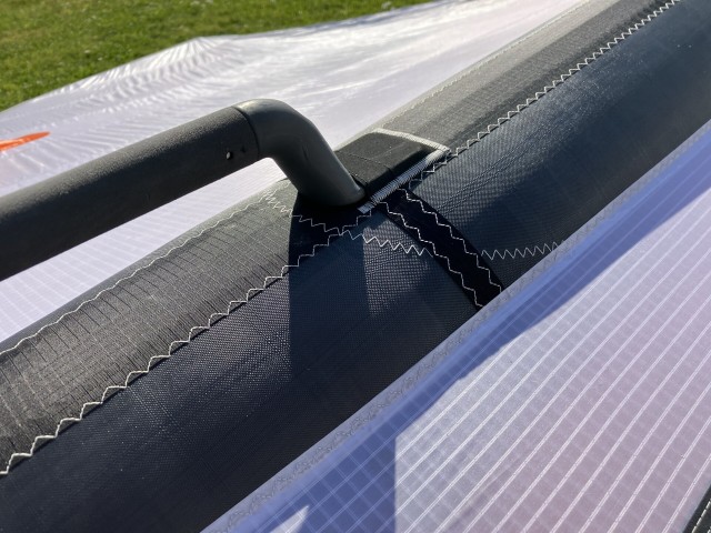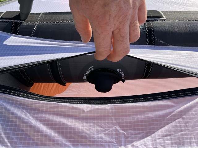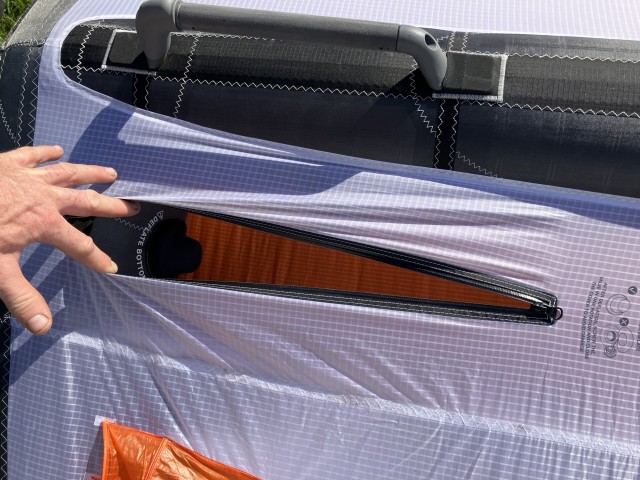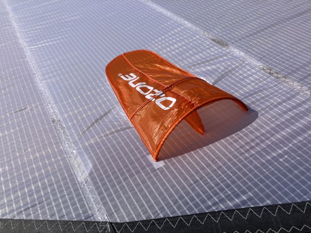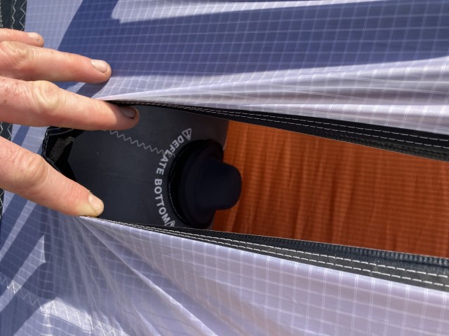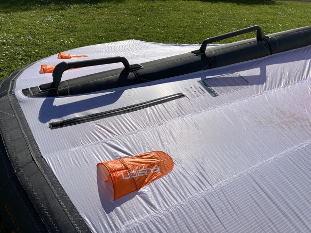 The second internal canopy panel that creates the ram-air structure is neatly stitched to the leading edge and strut similarly to the typical external canopy. Four ram-air inlets on the internal surface with a batten-style structure to keep them open, protected during storage by foam inserts. A spare or two would have been nice, as I can see myself losing one in haste to get on the water! There is a slimline waterproof zip (similar to those found on foil kites for deflation purposes) on the internal canopy, allowing access to the strut and leading edge valves. This also allows a sneak peek inside to see the internal ribs connecting the internal and external canopy surfaces, providing structural support and further optimising the airfoil profile.
