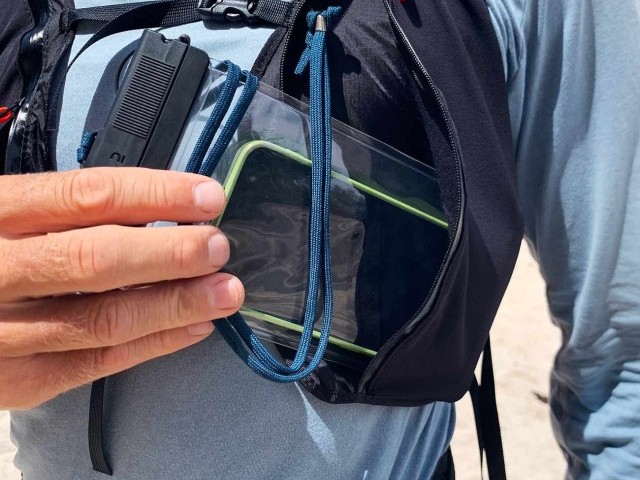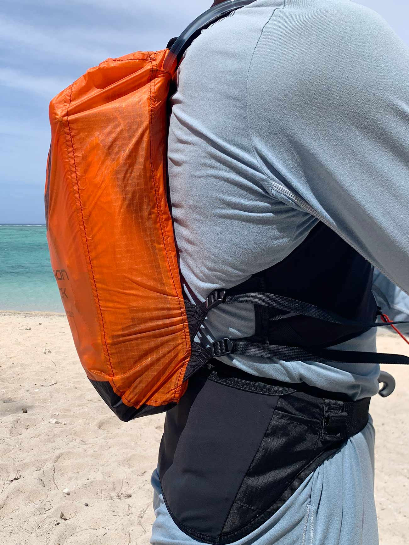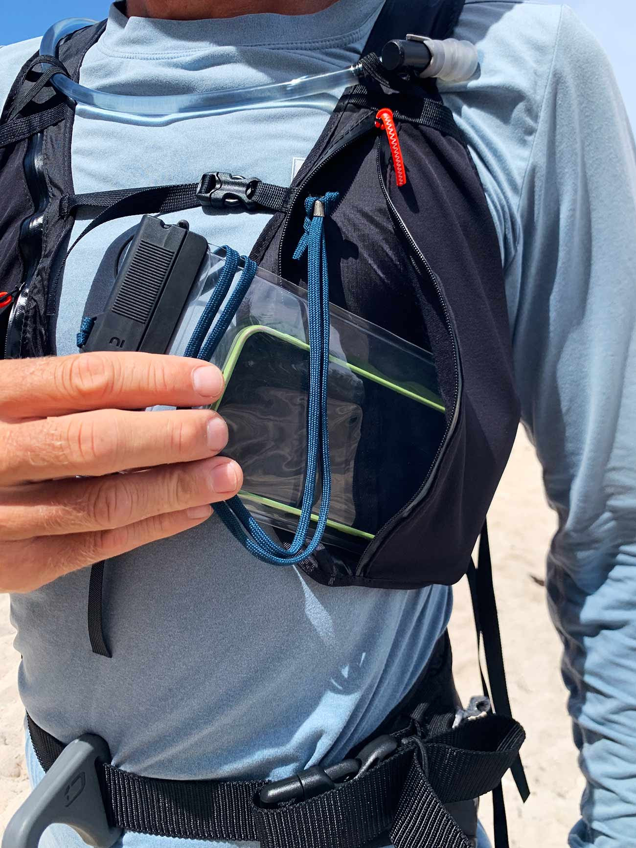 Thoughtful storage is integrated throughout. An internal zip pocket keeps smaller essentials safe, while stretch pockets on each front shoulder strap provide quick access to items like your phone (in a waterproof case), an emergency beacon, or even a GoPro. For longer missions, a dedicated rear compartment fits a 2L hydration bladder (not included), with bungee loops on the shoulder straps to keep the hose and mouthpiece right where you need them.