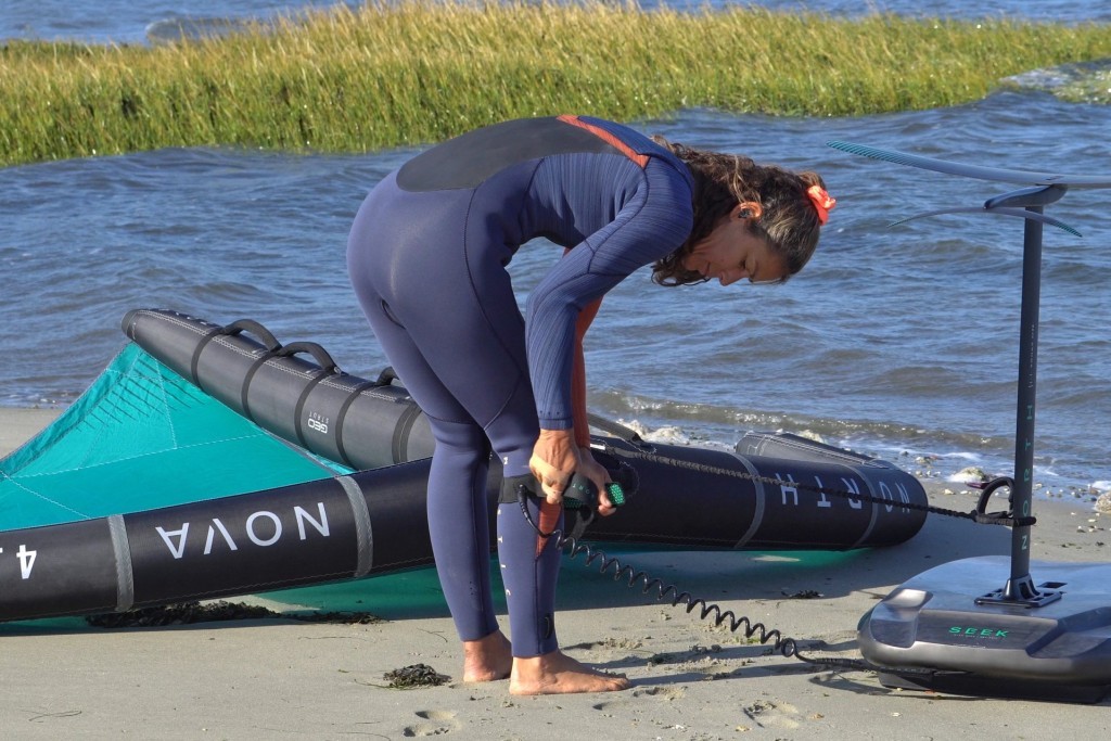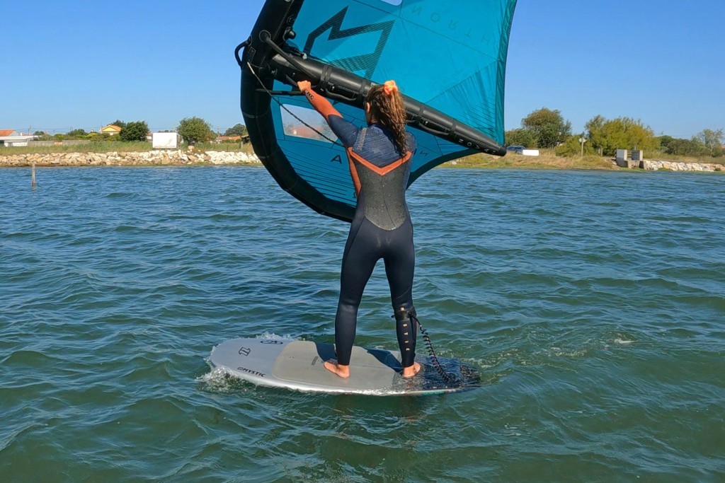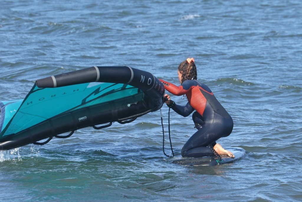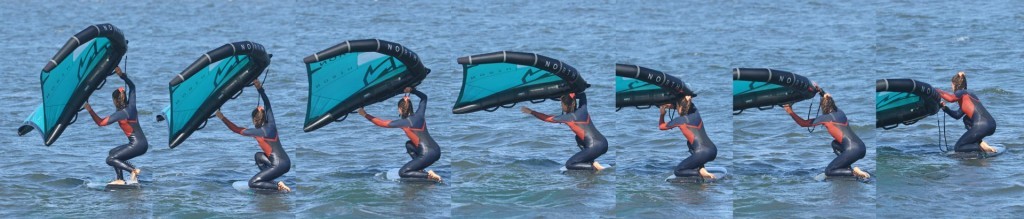 Stand Up: Use the wing to help. Lift your front arm high and sheet the wing in gently by pulling in with your back arm to help you stand up. If the wind is light you won’t get much help from the wing, so it’ll be mostly leg work. If it’s windy it will help. Be prepared to sheet out as soon as you’ve stood up.