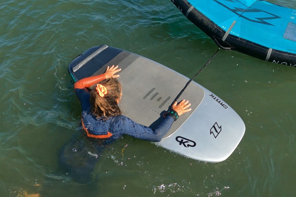 Before you can clamber aboard you need to consider the order of play. There are endless positions and combinations of where you and your beloved kit end up, so before springing into action, make sure that the board is down wind of you and the wing is down wind of the board. If it’s windy this is more likely a natural occurrence, if it’s light you may have to do some housekeeping. Whether the wind has positioned everything or you have, it’s worth making sure that your board leash won’t be in the way once you’re on the board. If it’s the wrong side of you, let the board drift away, float on your back and lift your legs over your leash.