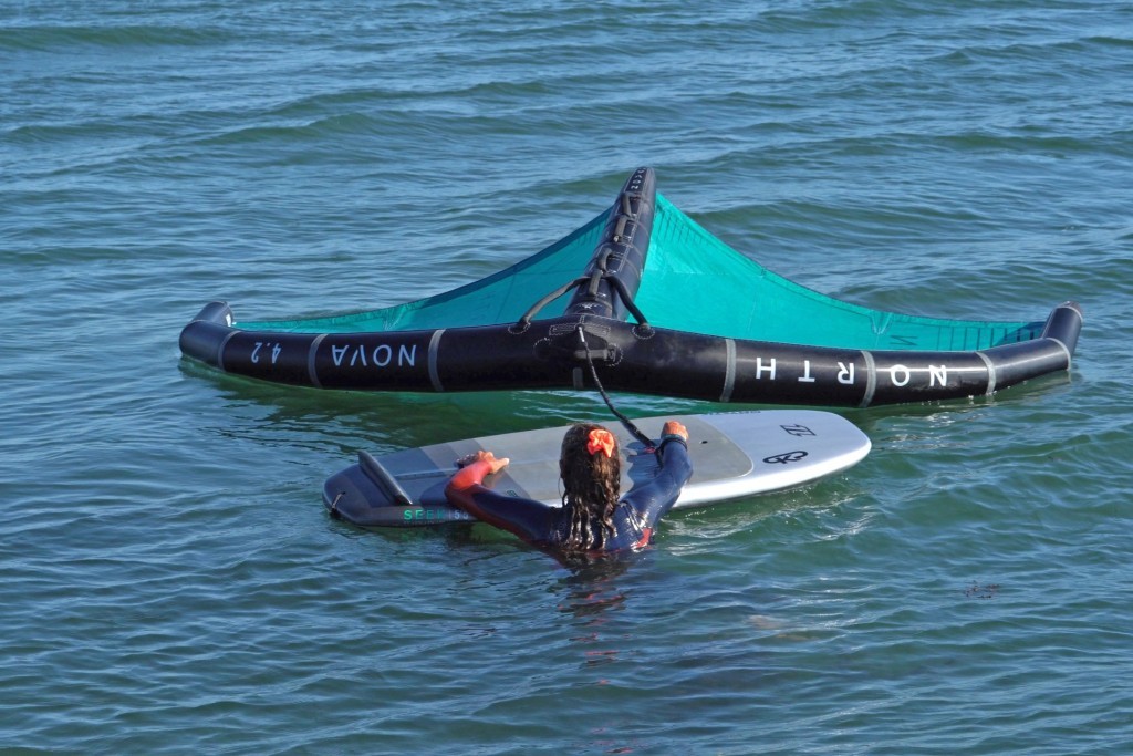 Wing for Support: Once you’ve on, use your wing leash to pull the wing in towards you until the centre of the leading edge butts up against the board. Now you have the luxury of placing both hands onto the leading edge, giving yourself something buoyant and supportive to lean on.