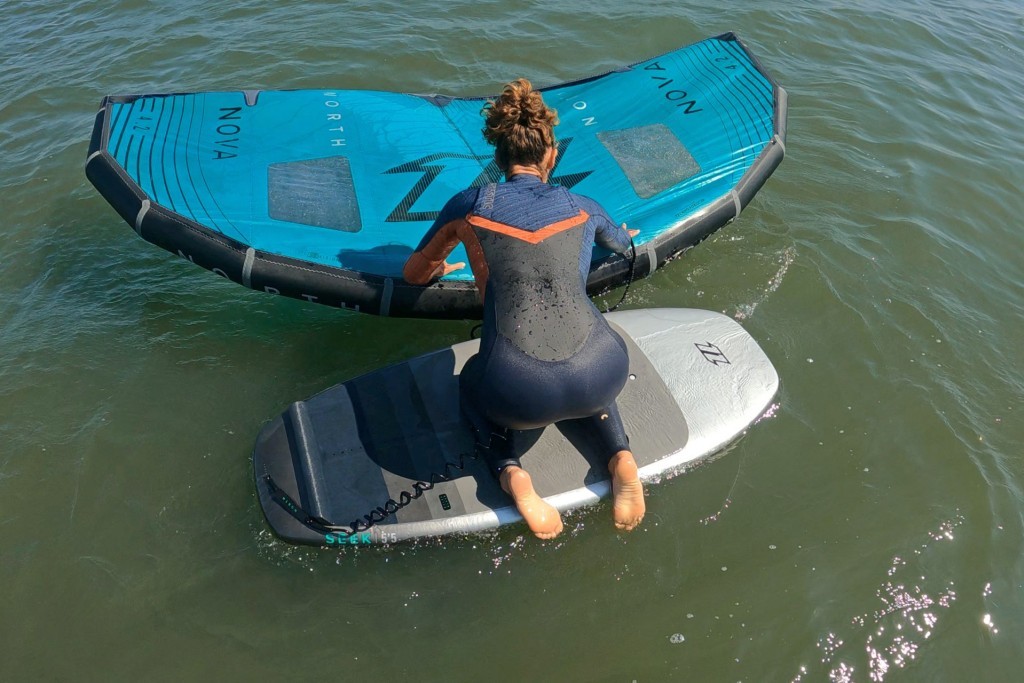 Position the Board: Move the wing back, so that the nose of the board turns up into the wind slightly. With the nose pointing up you’re less likely to catch the wing in the water when you stand.