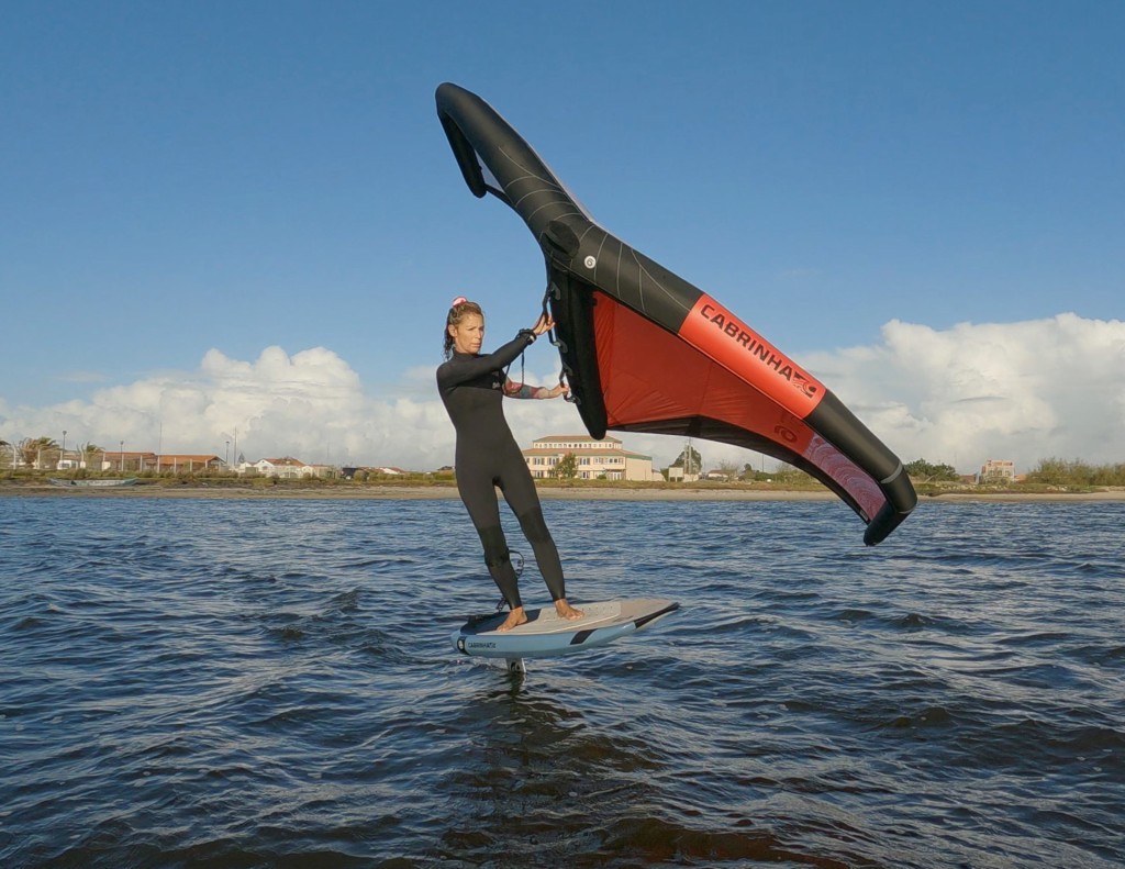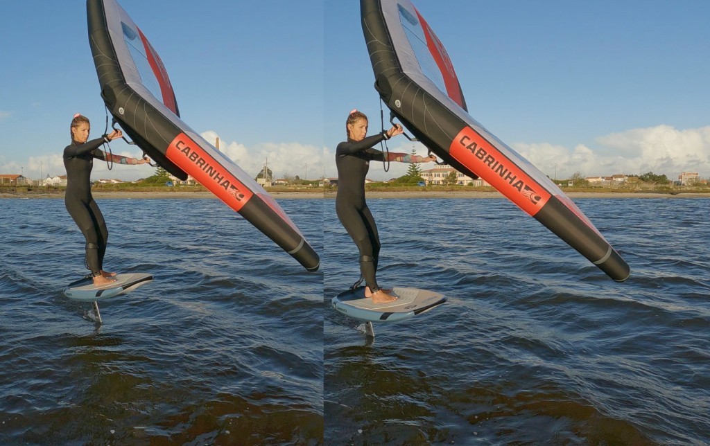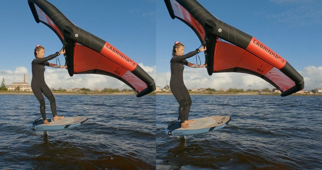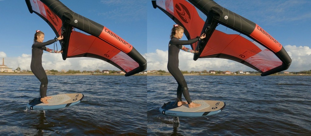 First and foremost, you need to be riding in a comfy toeside. As alluded to earlier, if you’re not balanced and in control, it’s probably not the best time to stand on one leg! From here, it’s a matter of incorporating all of the advantage points from above: a narrowed open off-set stance, gentle upwind course and keeping your wing forward. Here, you can see Karine cruising, comfortable and balanced in a relaxed toeside position.
