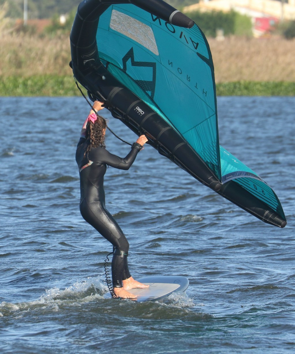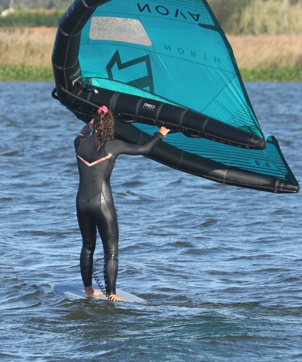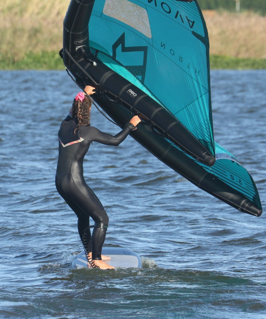 Essentially the most important part of getting up on the foil is staying down off it. Due to the very nature and name of Wing Foiling, we all want to get up and foiling. Watching someone who has already cracked the code, they’re up and off before you can say howthedevildidtheydothat. The time between getting forward momentum and then lifting up onto the foil will reduce the more you practice and the more comfortable and in control you become. The point here is to get yourself settled and ready, so that when you want to come up, you can. You choose when you’re balanced and ready, there’s no rush at first.