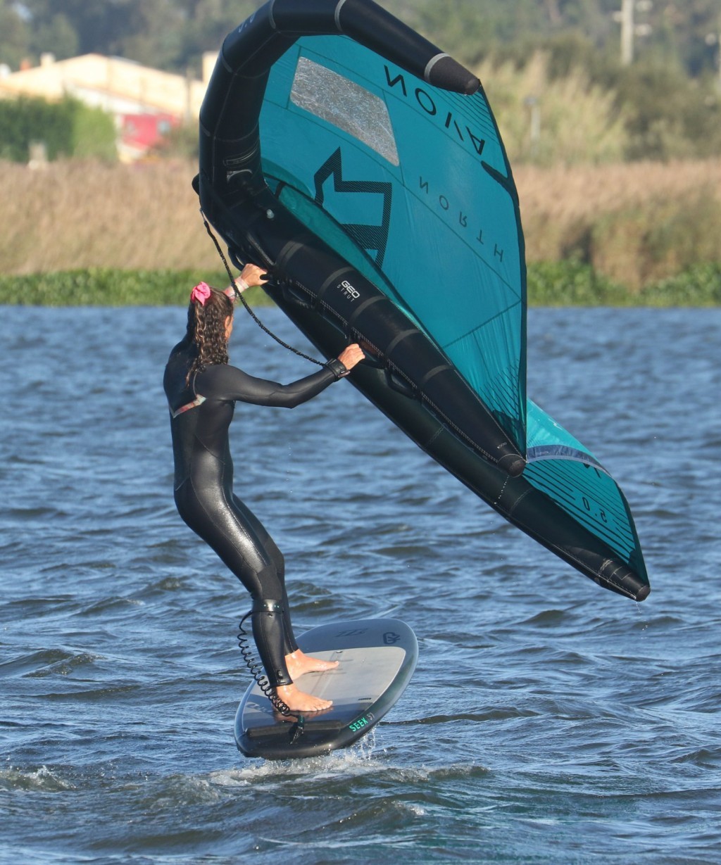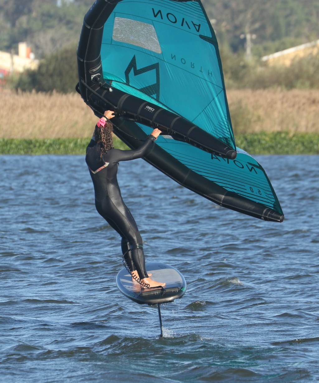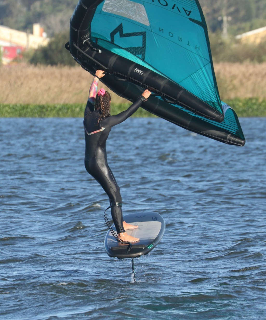 Dynamic but subtle aptly describes riding on the foil. You will find that as you come up and start to fly that you’ll need to make little adjustments, whether it be pulling your back foot slightly back to get some weight on your heel or pointing your front foot further forwards to take weight off your toes, shifting the wing up as it drops and sheeting out as it pulls. Stay standing and tall, keeping your balance over the board.