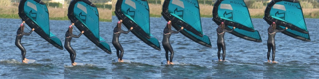 And finally, if you’re carving up into wind. Two possibilities here. Either you’ve got both feet on the windward side of the board, or you’re trying to come up without bearing away. It’s still possible to do this, but you’ll have to concentrate on pushing the wing forwards as you rise to weight the front of the board. Alternatively sort your feet out and keep the board trimmed!