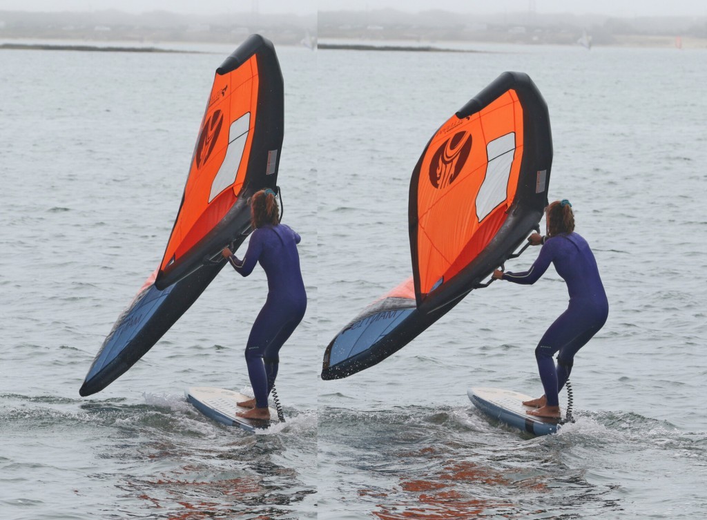 You’ll feel it. That beautiful sensation that you haven’t forgotten since that very first time. This time, you may be under a bit more physical duress, slightly out of breath, and with an elevated heartbeat, but as the foil starts to plane and lift underneath you, your cue comes up. Either push down on your back leg or if your rear foot isn’t far enough back, take a little step back and then push down to fly. As the board comes off the water, you can sheet out and turn the board upwind by gently weighting your heels.