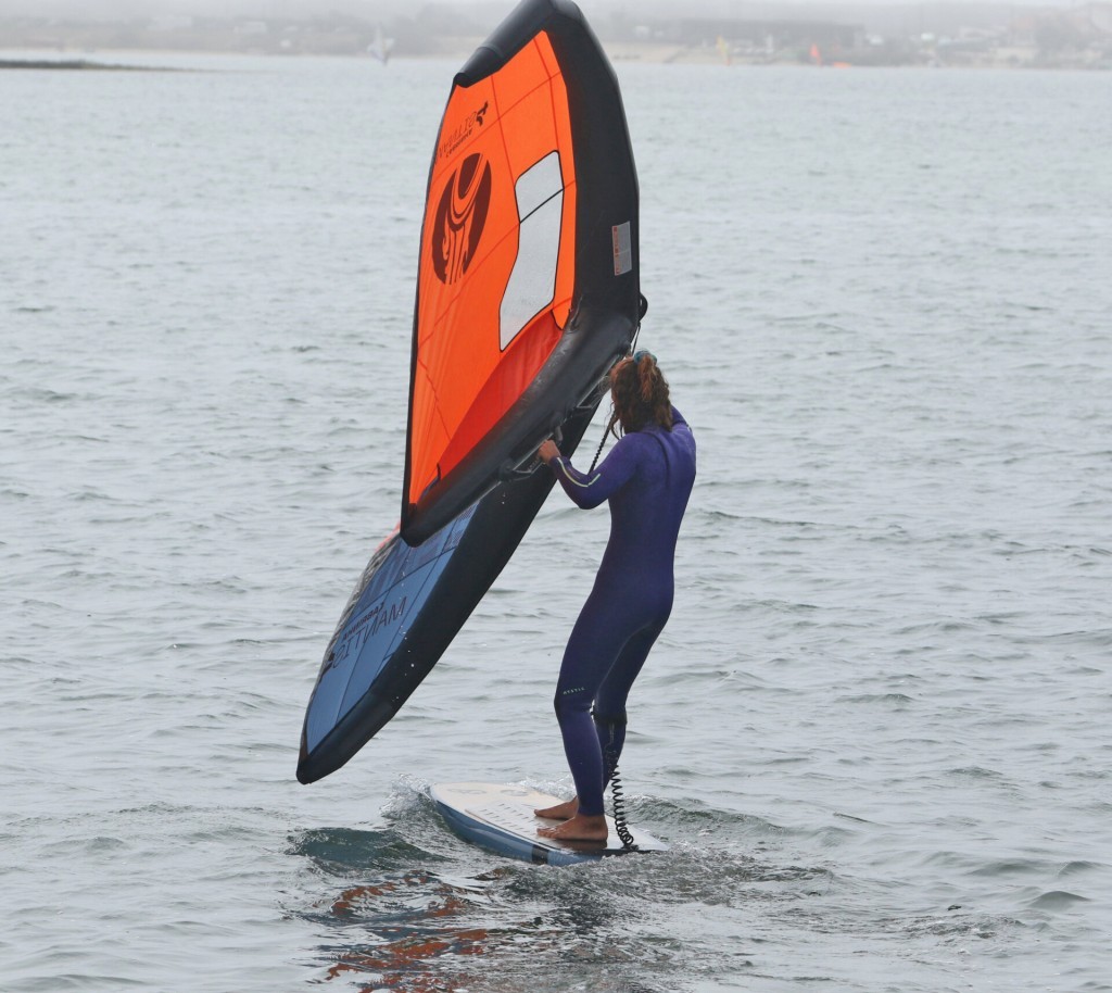 This should be familiar ground. Anytime you’re not flying on your foil, you should pinch upwind while waiting for a gust. Your front foot has a pretty standard position, whereas your rear foot is more mobile. This may mean that you’ve moved your rear foot forward to trim the board (more essential on smaller boards), and you might be weighting your heels to dig a bit of rail in the water for some added resistance. If there’s enough breeze, you’ll be flying the wing high and looking upwind for a gust. Once you see a gust coming, make sure you flatten the board. You can move your rear foot across the centreline and angle it slightly forward to get into an open offset stance. If you previously moved it forward, you may want to step your rear foot back slightly. Now you’re ready for the gust, waiting to feel if it materialises in your wing.