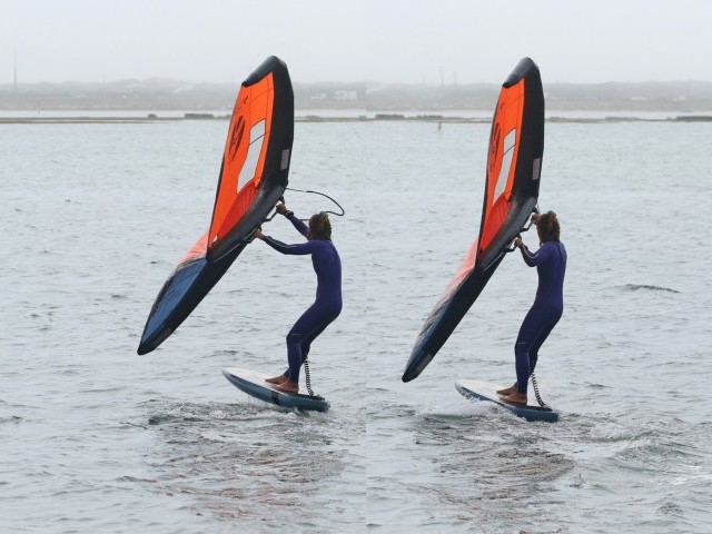 You should be accustomed to bearing away. The new part here is getting used to bearing away with less power and discovering how much less is still enough to pump. Let your arms extend with the pull, and then, using both arms, pull the wing in towards you, keeping yourself stiff whilst pushing your front foot forward. If the board moves, you know it’s worth sticking with. In the photo, you can see that Karine is quite upright, pulling the wing to her shoulders. This keeps the wing high and prevents it from catching in the water. Standing tall also means she can transfer the power through her body and into the board. You can see how the nose pushes down, so there is enough oomph in the wing to generate more. Game on.