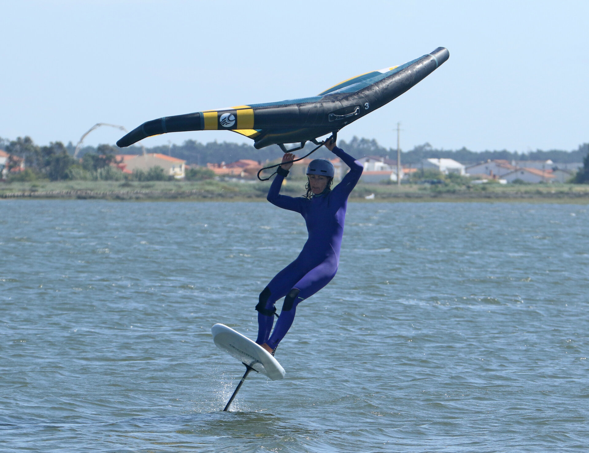 This tack can feel overwhelming at first. Carving up into the wind whilst staying over the board will feel very alien. Practice raising the wing so you can stay over the board and carve without feeling like falling to the inside.