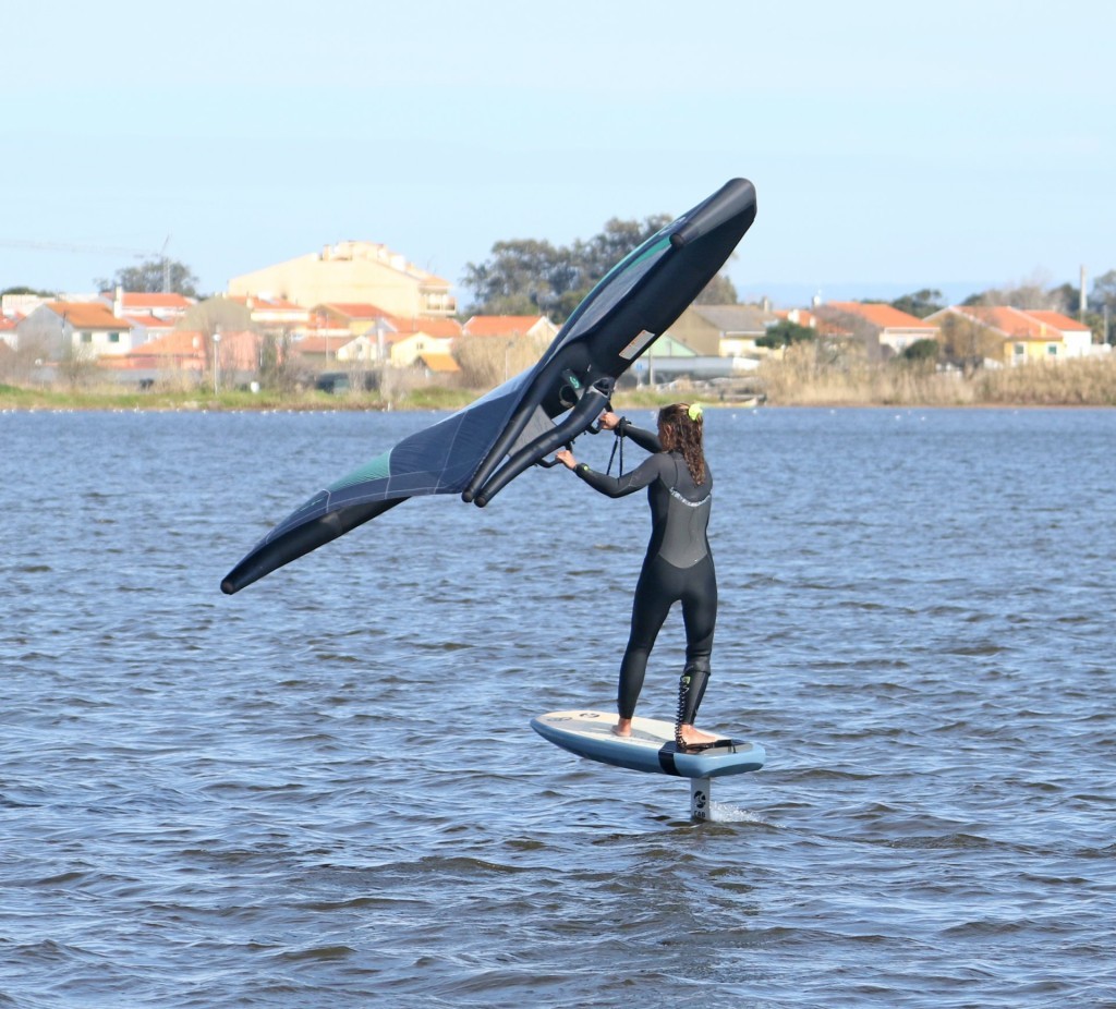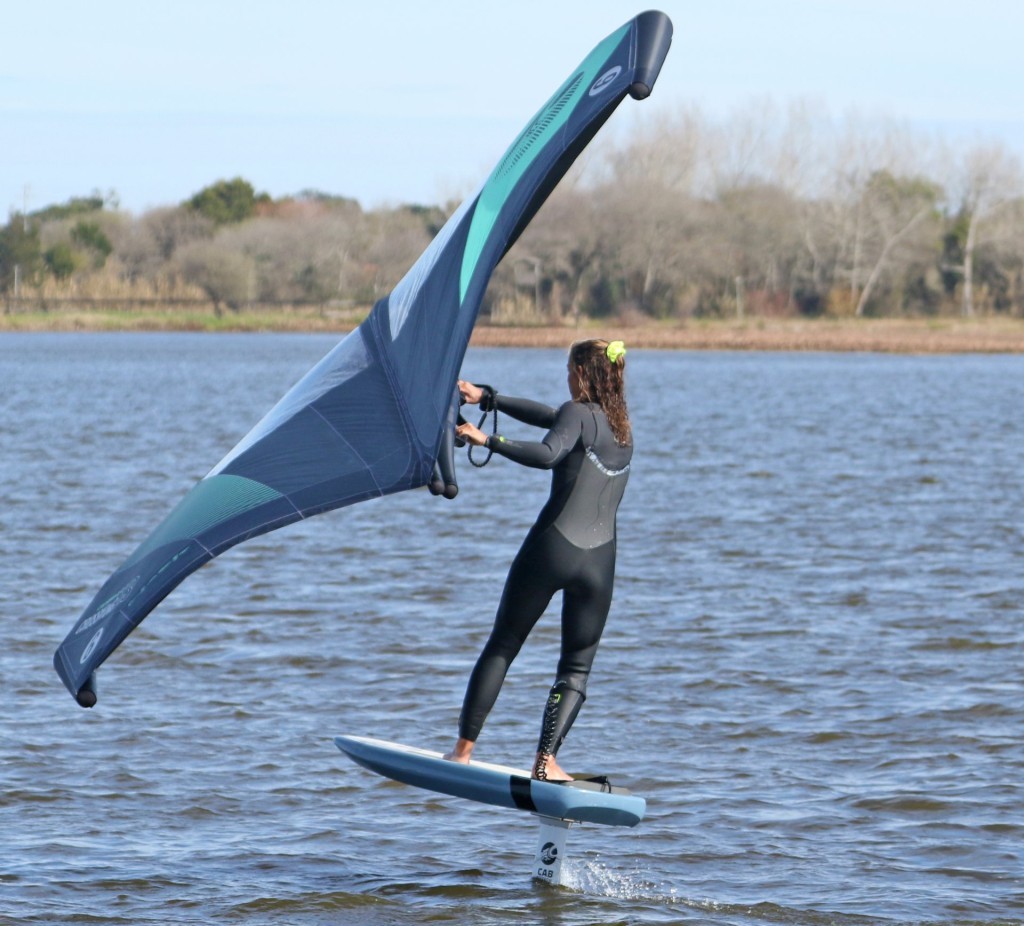 In essence, you’re aim is to maintain your position, and therefore, keep turning/carving. However, you’re not frozen in a static position. You still need to keep the power on and trim the board from nose to tail to stop yourself breaching or dropping down. As your board turns further off the wind your lower body needs to follow, whilst your upper body holds the wing in a similar position. This allows you to keep power in the wing, and also helps keep you balanced and centred over the board, and keep your weight on both feet. As Karine approaches downwind you can see that the angle of her wing hasn’t changed, she’s still catching wind, but by twisting at the waist her lower body is turning with the board. It’s important to keep some flex in your knees. If you stand bolt upright, you’ll get stuck in position.