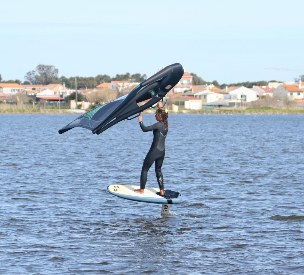 Game on; you’re coming out strong foot first heel side, into a well-rehearsed stance. This should make staying up a little less difficult as it will be akin to coming onto the foil. You’re on a broad reach and as such the same principles apply. You can and should use the wing to help you. By concentrating on getting your front hand down and away from you you’ll counter the fact that your weight might be back and encourage forward drive. From this position, you can turn your head, move the wing back a touch, and drive against your back leg to turn yourself back onto an upwind course. Karine’s got power on; she’s balanced and now turns upwind.